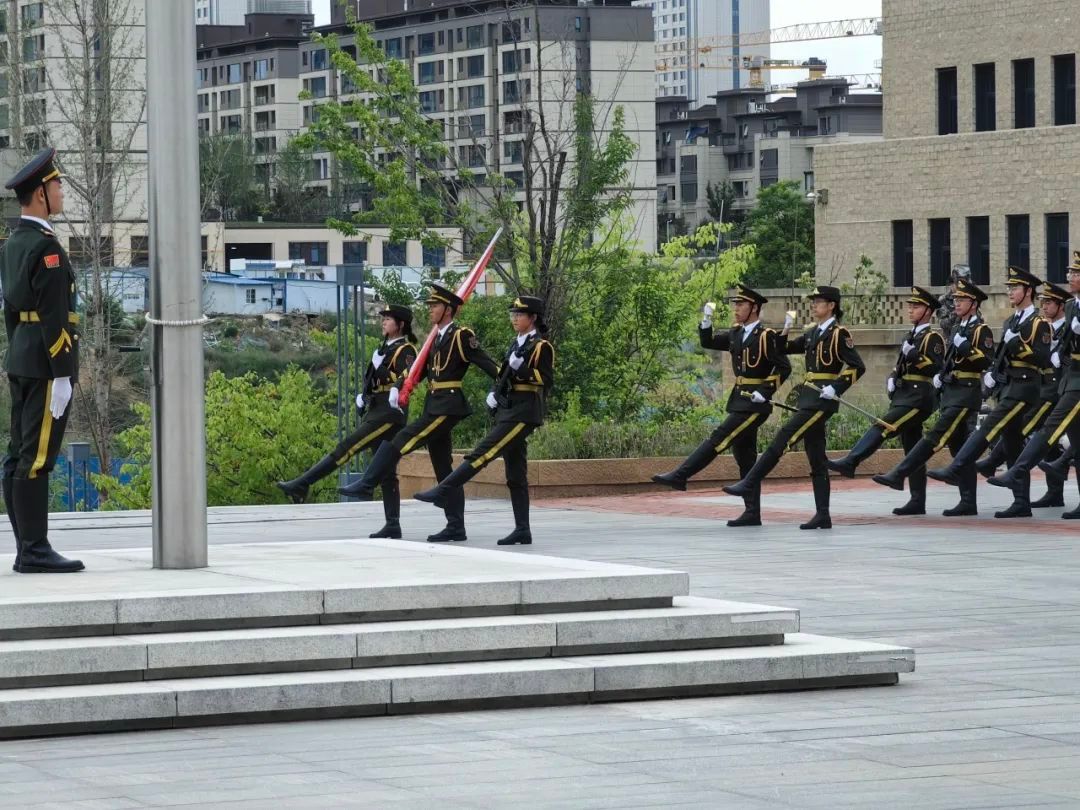 在庄严激昂的国歌声中,国旗护卫队步伐整齐,护送国旗入场,伴随着鲜艳的五星红旗冉冉升起,全体师生高唱国歌,庄严地向国旗行注目礼。