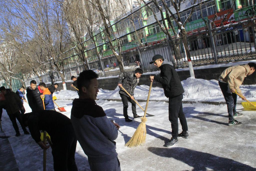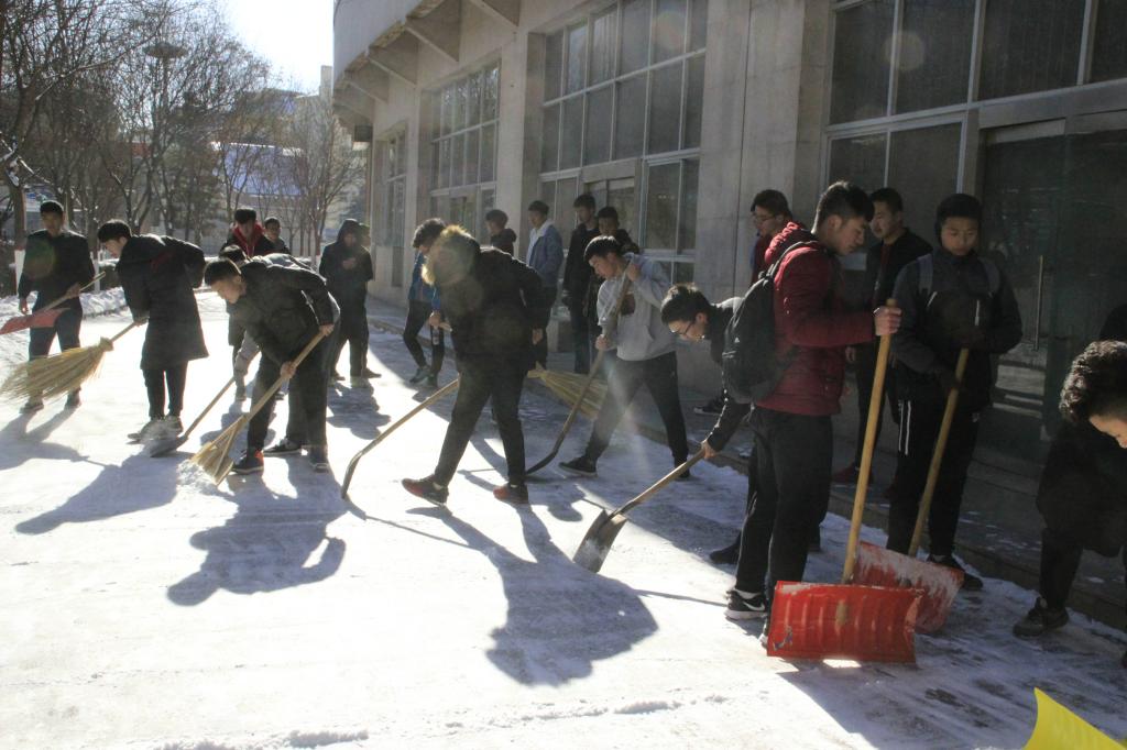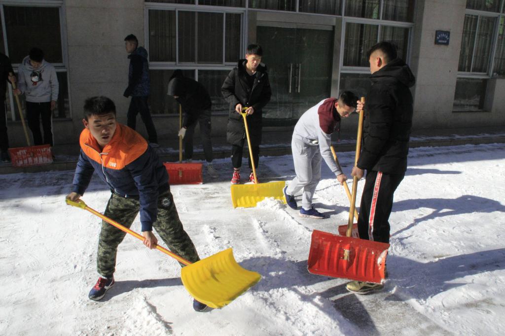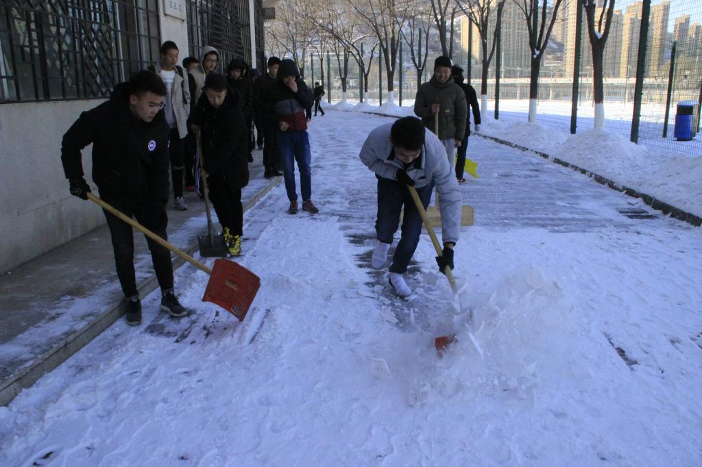 在两个多小时的除雪过程中,师生们不畏严寒、不怕苦、不喊累、干劲十足,清理了田径场周边和球类运动场所有的积雪,为期末考试的老师、同学们正常出行提供了便利条件,为构建文明和谐校园贡献出自己的一份力量。