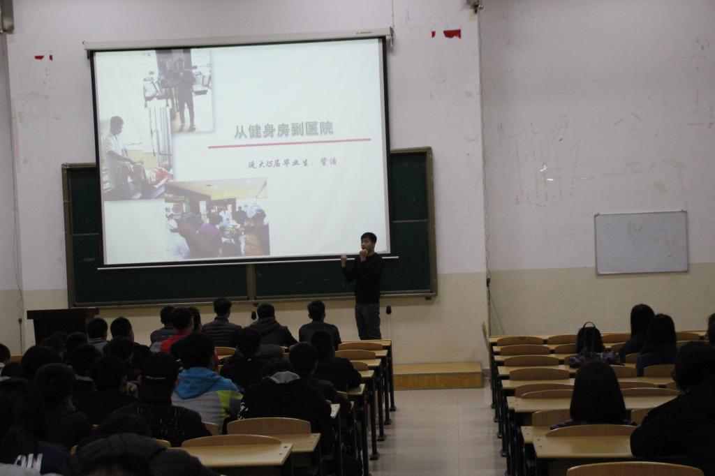 訾浩的经验分享以《从健身房到医院》为主题,讲述了他大学时的实践经历以及工作后的变迁成长,通过解读自己代课及临床积累的丰富案例,深入展示了人体肌肉功能及其应用,进一步分析了体育专业在社会上工作方向的拓宽,并告诫学弟学妹在学校要把课程学活了,让训练来源于生活,回归于生活,努力才是前进的唯一捷径。交流结束后同学们建立了“健康生活”讨论微信群,利用社交媒体与学长进行更深入细致的交流。