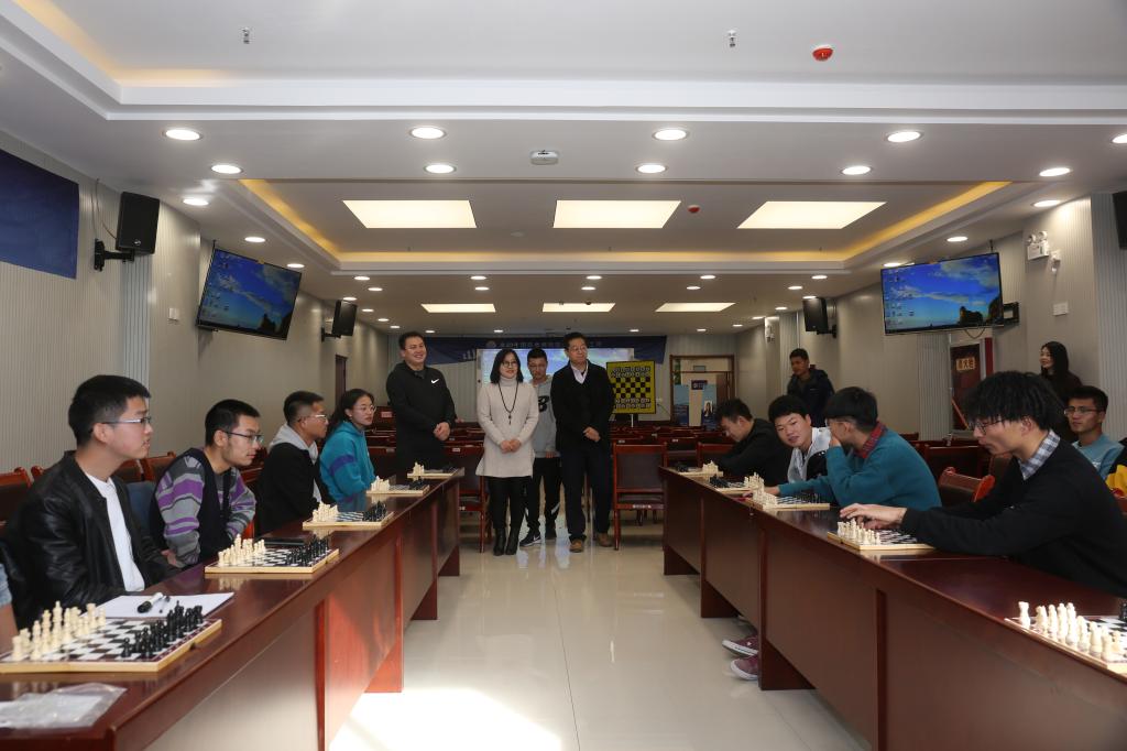 10月26日下午赵雪为全新讯师生进行国际象棋普及知识讲座,并与王锐同全新讯学生们进行世界冠军国际象棋车轮战。大家共同应对两位大师的攻击,学生们面对新鲜的棋种显得非常兴奋。