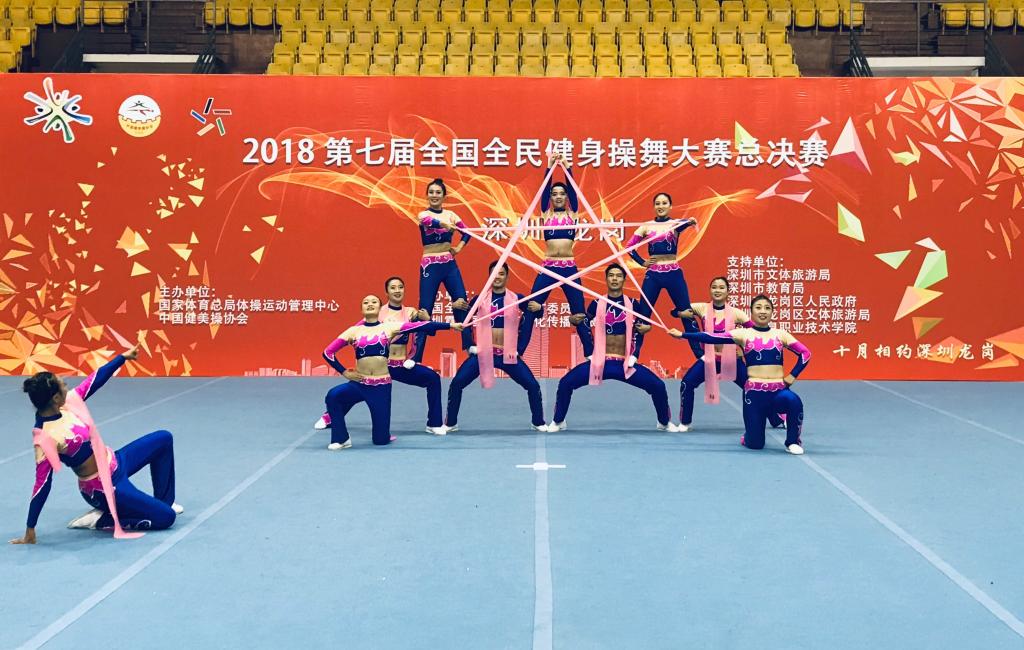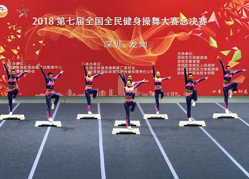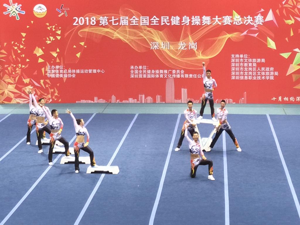 由国家体育总局、中国健美操协会主办的2018年第七届全国全民健身操舞大赛总决赛于10月22日至28日,首次在深圳举行。是目前我国健美操赛事中比赛规模最大的赛事,来自全国30多个省市6200余名运动员对竞技健美操、有氧健身操、时尚健身课程、广场健身舞、街舞、民族健身操舞、大众体操共7个项目进行角逐。全新讯健美操队在今年年初就开始准备此项赛事,在暑假期间就开始刻苦训练、精心编排,经过二个多月的赛前集训,在领队郑兵、教练宗延伟、张智颖的带领下参加的2016全国踏板健身操成人套、2016《民族健身操规定动作》之藏族、2017全国规定套路校园踏板操、街舞Streetjazz推广套路(2015),4个项目获得一等奖,2016全国阳光校园健身操皮筋操普及套、街舞Hiphop推广套路(2015)、2016全国阳光校园健身操皮筋操表演套,三个项目获得特等奖。创历年来参加此项赛事最好成绩,教练员宗延伟和张智颖因成绩突出连续三年被评为“优秀教练员”。
