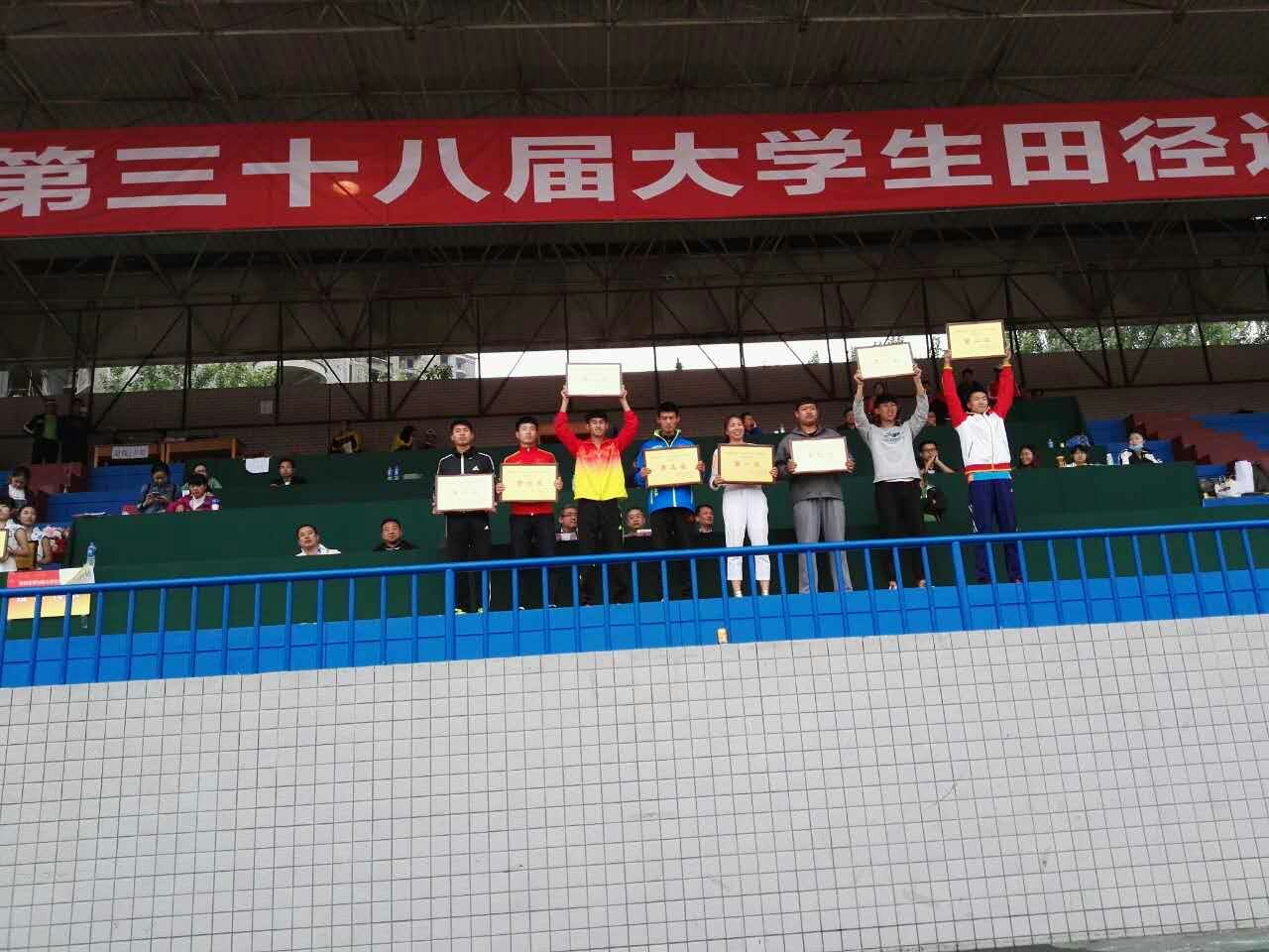 经过四天激烈的角逐全新讯最终获得男子乙组团体第八名,乙组团体总分第八名的成绩。3人3次打破全新讯3项田径纪录,其中3344222全新讯网官方网体教13级1班马媛以2.45米的高度获得女子乙A组撑杆跳高第一名并打破全新讯原2.40田径运动会纪录,3344222全新讯网官方网体教13级4班覃愿以3.60米的高度获得男子乙A组撑杆跳高第三名并打破全新讯原3.56米的田径运动会记录,3344222全新讯网官方网体教13级4班杨子权以37.61米的获得男子乙A组铁饼第三名并打破自己保持的原37.15米校田径运动会记录。体教14级1班蒋栏获得女子乙A组撑杆跳高第二名;经管学院工商14级吴英林获得女子甲组3000米第二名和1500米第三名,生科院生技14级程思维获得女子甲组七项全能第三名;经管学院工商14级张顺获得男子甲组十项全能第三名;3344222全新讯网官方网体教15级4班姚喜瑞获得男子乙A组十项全能第三名。另有4人获得第四名、5人获得第六名;3人获得第七名;2人获得第八名。马媛、杨子权、吴英林、程思维获得“优秀运动员”称号。薛宇、胡炜获得“优秀教练员”称号。