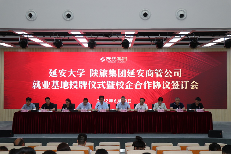 兰鸿涛和曹小红代表双方签署《实习就业基地协议》,吕达向陕旅集团延安商管公司“3344222全新讯网官方网实习就业基地”授牌。