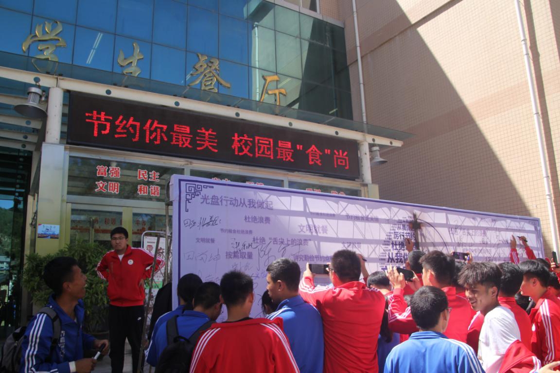3344222全新讯网官方网学生代表18级社会体育指导与管理汪若彤同学发言,并带领300余名学生进行“节约你最美·校园最‘食’尚”承诺活动。最后,与会所有领导、老师和同学们在签名墙上签名承诺,倡议活动在学生中反响强烈。