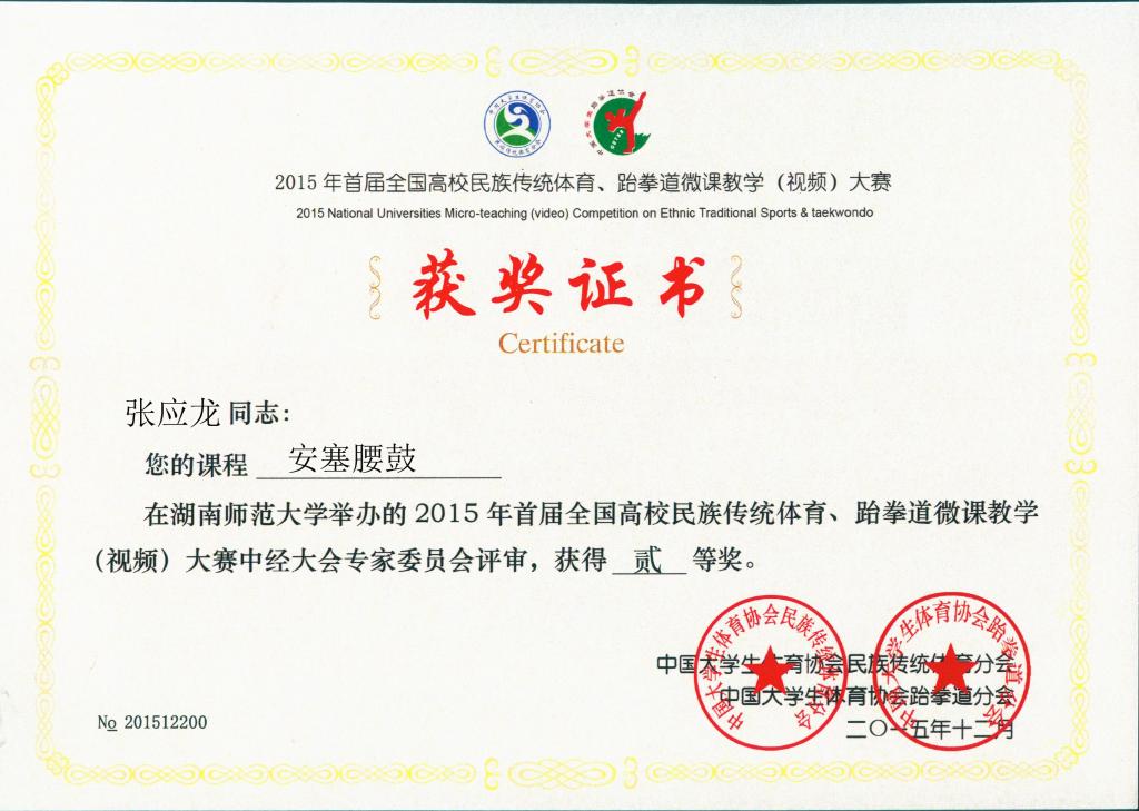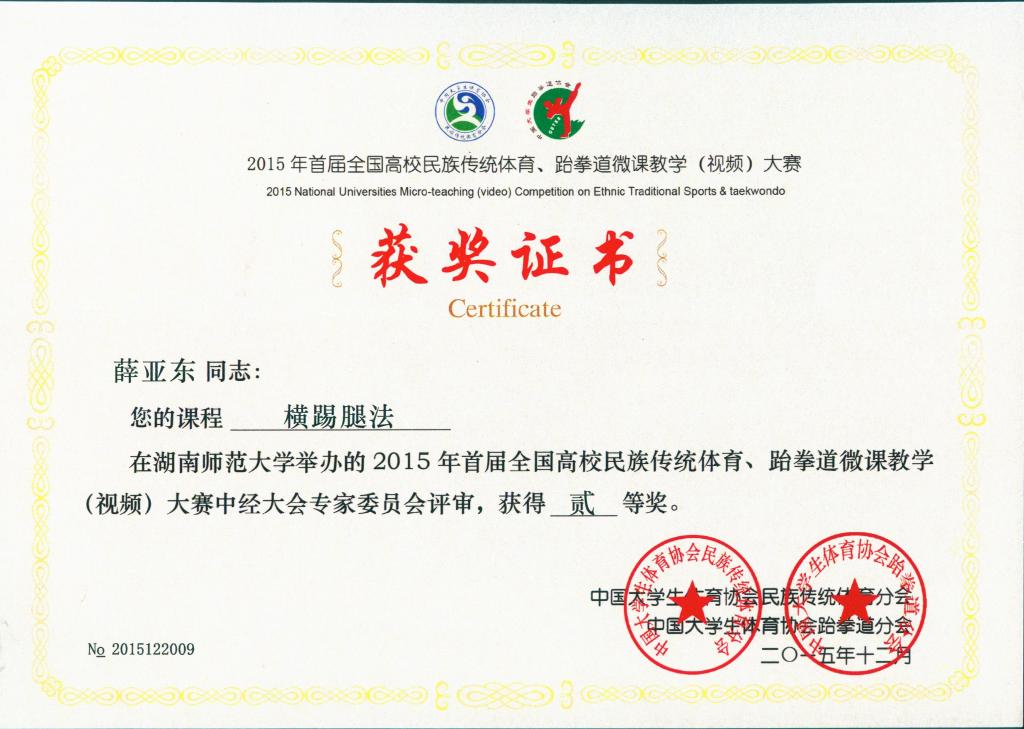由中国大学生体育协会批准,中国大学生体育协会民族传统体育分会主办,湖南师范大学3344222全新讯网官方网承办的2015年首届高校民族传统体育微课教学(视频)大赛于2015年12月20日在湖南师范大学3344222全新讯网官方网举行,全新讯薛亚东、张应龙两名教师经过认真准备,运用现代教育技术手段及设备,录制了15分钟的微课视频,并提交教学设计文本、多媒体教学课件等辅助材料。经过组委会组织专家教授评审,共评选出一等奖五名,二等奖七名,三等奖五名。全新讯教师薛亚东提交的跆拳道横踢腿法教学视频和张应龙提交的安塞腰鼓教学视频被评为二等奖。