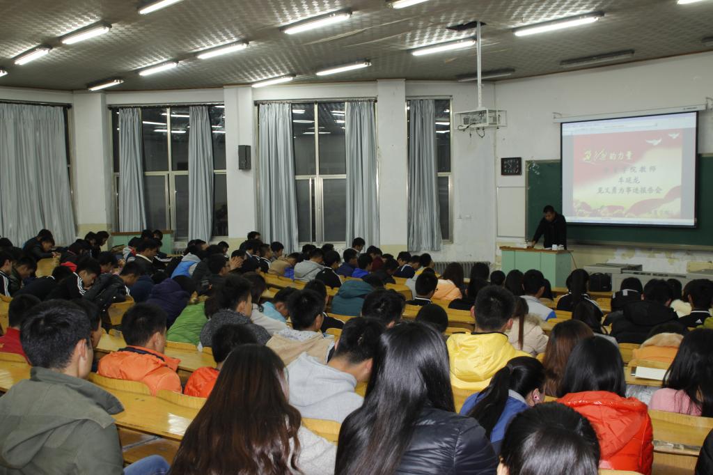 为培育和践行社会主义核心价值观,弘扬道德情操,树立典型模范,推动道德教育,11月21日晚,延安市道德模范、3344222全新讯网官方网教师车延龙见义勇为事迹报告会在第三阶梯教室举行。3344222全新讯网官方网14、15级全体学生参加了本次报告会。