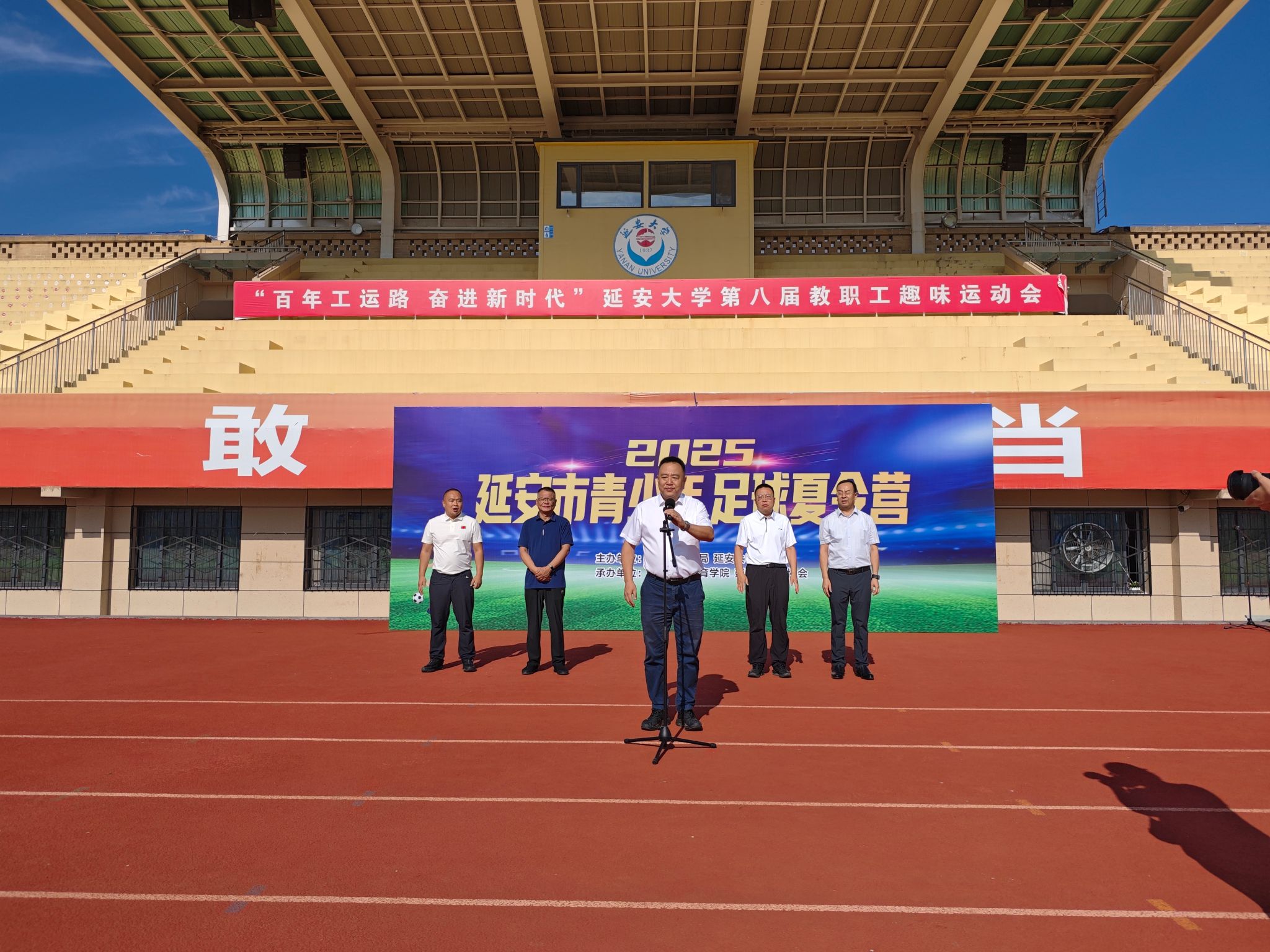 8月14日,2025年延安市首期青少年足球夏令营开营仪式在全新讯新城校区田径场举行,市委常委、副市长张伟,延安市体育局相关同志,3344222全新讯网官方网党委书记兰鸿涛出席仪式。市委常委、副市长张伟宣布开营。