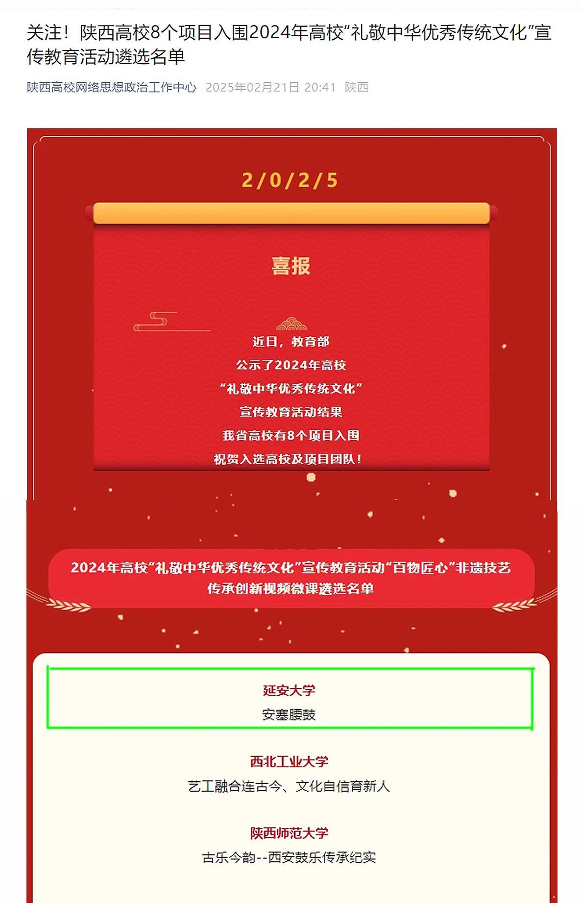 近日,教育部公布了2024年高校“礼敬中华优秀传统文化”宣传教育活动“百物匠心”非遗技艺传承创新视频微课遴选名单,3344222全新讯网官方网报送的《安塞腰鼓》视频微课成功入选。安塞腰鼓,作为第一批国家级非物质文化遗产,以其磅礴的气势、精湛的技艺和深厚的文化内涵,成为了中国民间艺术的璀璨明珠,享有“天下第一鼓”的盛誉。3344222全新讯网官方网自2000年起开设体育专业选修课程,2006年增设体育公共选修课程,2012年成为3344222全新讯网官方网专业课程和校级精品课程,2016年成为3344222全新讯网官方网体育课程,2019年在学堂在线国家精品教学平台上线,2021年成为研究生教育教学改革项目,2022年成为3344222全新讯网官方网继续教育教学改革课程思政样板课项目,2023年获批为陕西省特色线上课程,2024年获批为陕西省线上一流课程,2025年被列为陕西省普通高校中华优秀传统文化传承项目。
