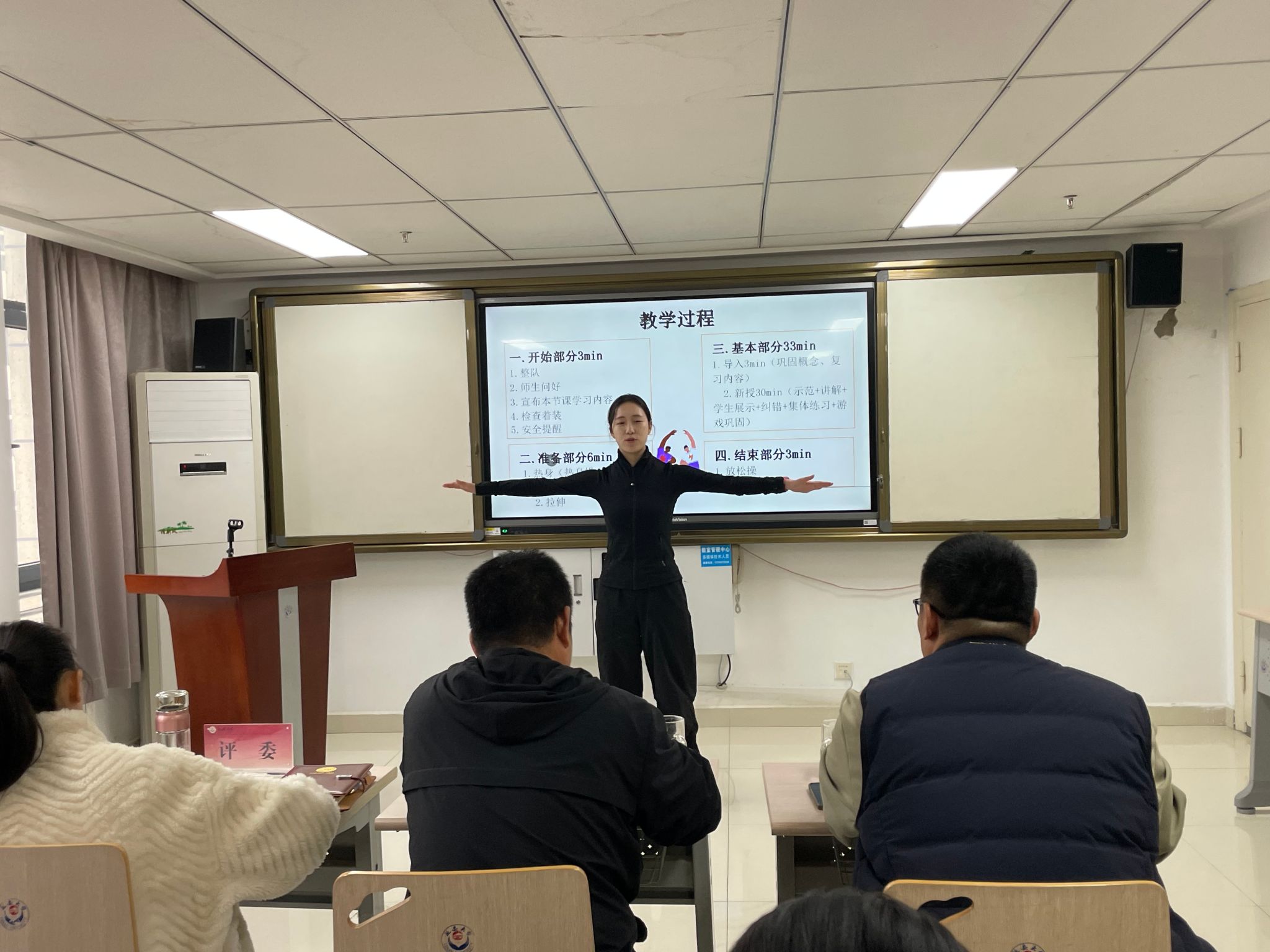 本次比赛分为学硕(体育学)、专硕(学科教学(体育))两组进行,学硕组由杜春斌教授、薛亚东副教授、高鹏副教授担任评委;专硕组由李世荣教授、许荟蓉副教授、付东阁博士担任评委。参赛选手通过教学设计、说课、无生试讲以及答辩环节展示自己的基本功,内容涉及篮球、羽毛球、健美操、武术等多个运动项目。参赛选手说课材料准备充分,课堂教学目标明确,教学思路清晰,教学过程合理,语言表达流畅。