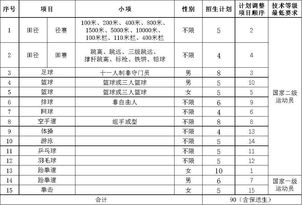 2.拟调整增加计划按照跆拳道(女)→田径(径赛)→足球(非守门员)→田径(田赛)→篮球(女)→网球→跆拳道(男)→空手道→排球→篮球(男)→乒乓球→羽毛球→体操→游泳→拳击的项目顺序依次进行,每轮逐项增加1个计划,直到完成招生计划。