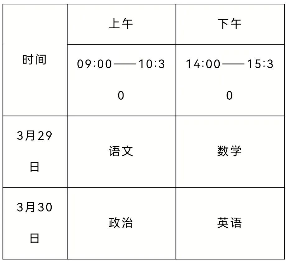 文化考试由教育部教育考试院和省级招生考试机构参照普通高考有关规定组织实施。文化考试科目为语文、数学、政治、英语四科,每科满分为150分,四科满分为600分,使用国家通用语言文字作答。考生于2025年3月29、30日按时参加普通高考报名所在地省级招生考试机构组织的文化考试。